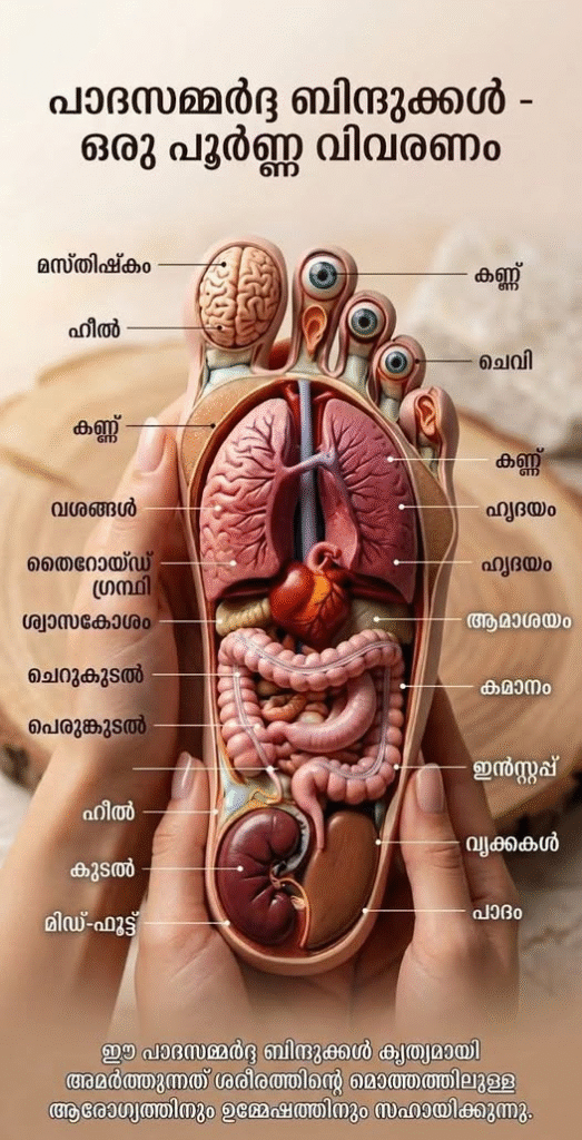 ”ഈ പാദസമ്മർദ്ദ ബിന്ദുക്കൾ കൃത്യമായി അമർത്തുന്നത് ശരീരത്തിന്റെ മൊത്തത്തിലുള്ള ആരോഗ്യത്തിനും ഉന്മേഷത്തിനും സഹായിക്കുന്നു.”