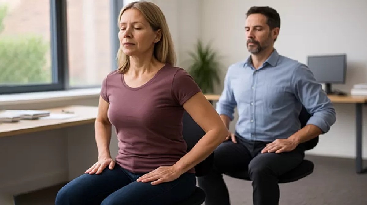 “ജോലി സ്ഥലത്തിരുന്ന് തന്നെ ഈ വ്യായാമം ചെയ്യാം. എഴുന്നേൽക്കേണ്ടതില്ല. ഇത് പേശികളെ ശാന്തമാക്കുകയും വേദന കുറയ്ക്കുകയും ചെയ്യുന്നു.”