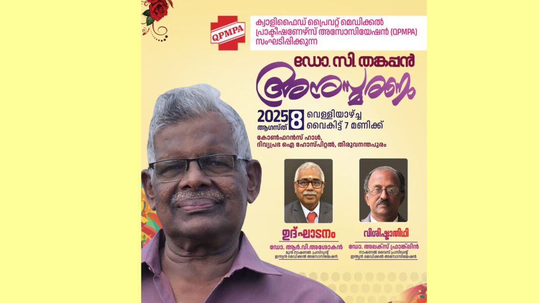 തിരുവനന്തപുരം : സംസ്ഥാനത്തെ സ്വകാര്യമേഖലയിലെ ഡോക്ടര്മാരുടെ സംഘടനയായ ക്വാളിഫൈഡ് പ്രൈവറ്റ് മെഡിക്കല് പ്രാക്ട്രീഷണേഴ്സ് അസോസിയേഷന്റെ (QPMPA) ആഭിമുഖ്യത്തില് നാളെ (2025 ആഗസ്റ്റ് 8 വെളളിയാഴ്ച) വൈകിട്ട് 7 മണിക്ക് മുന് പ്രസിഡന്റ് ഡോ.സി.തങ്കപ്പന് അനുസ്മരണം നടക്കും. കുമാരപുരം ദിവ്യപ്രഭ ഐ ഹോസ്പിറ്റല് എ ബ്ലോക്ക് കോണ്ഫറന്സ് ഹാളില് വെച്ച് നടക്കുന്ന അനുസ്മരണം സമ്മേളനം